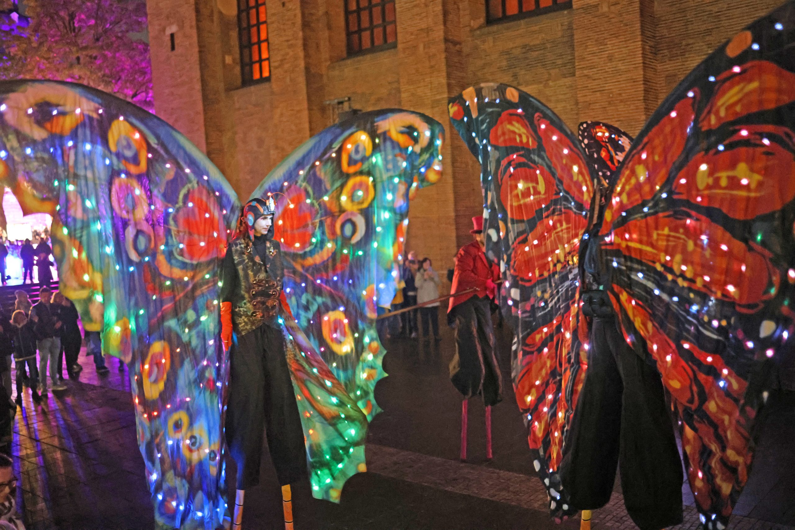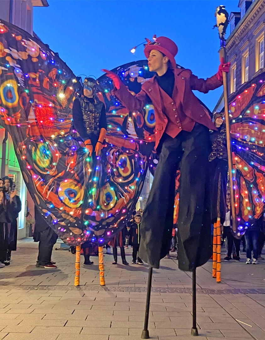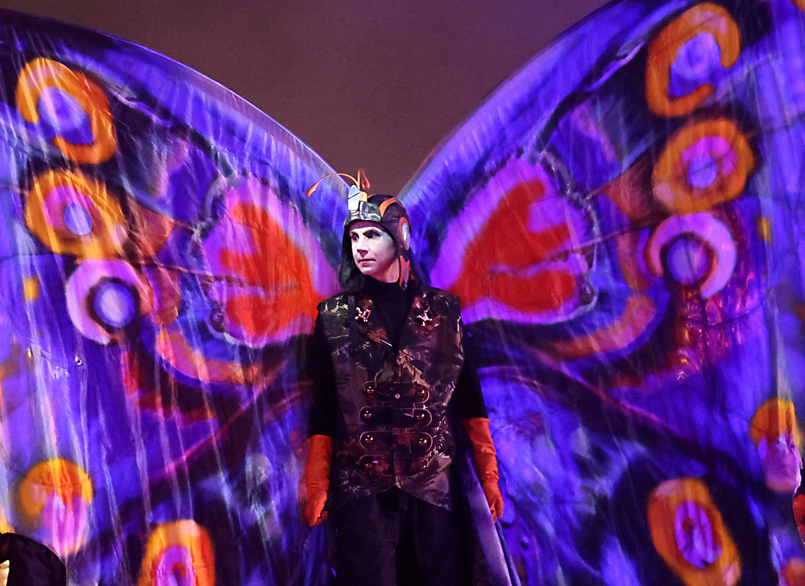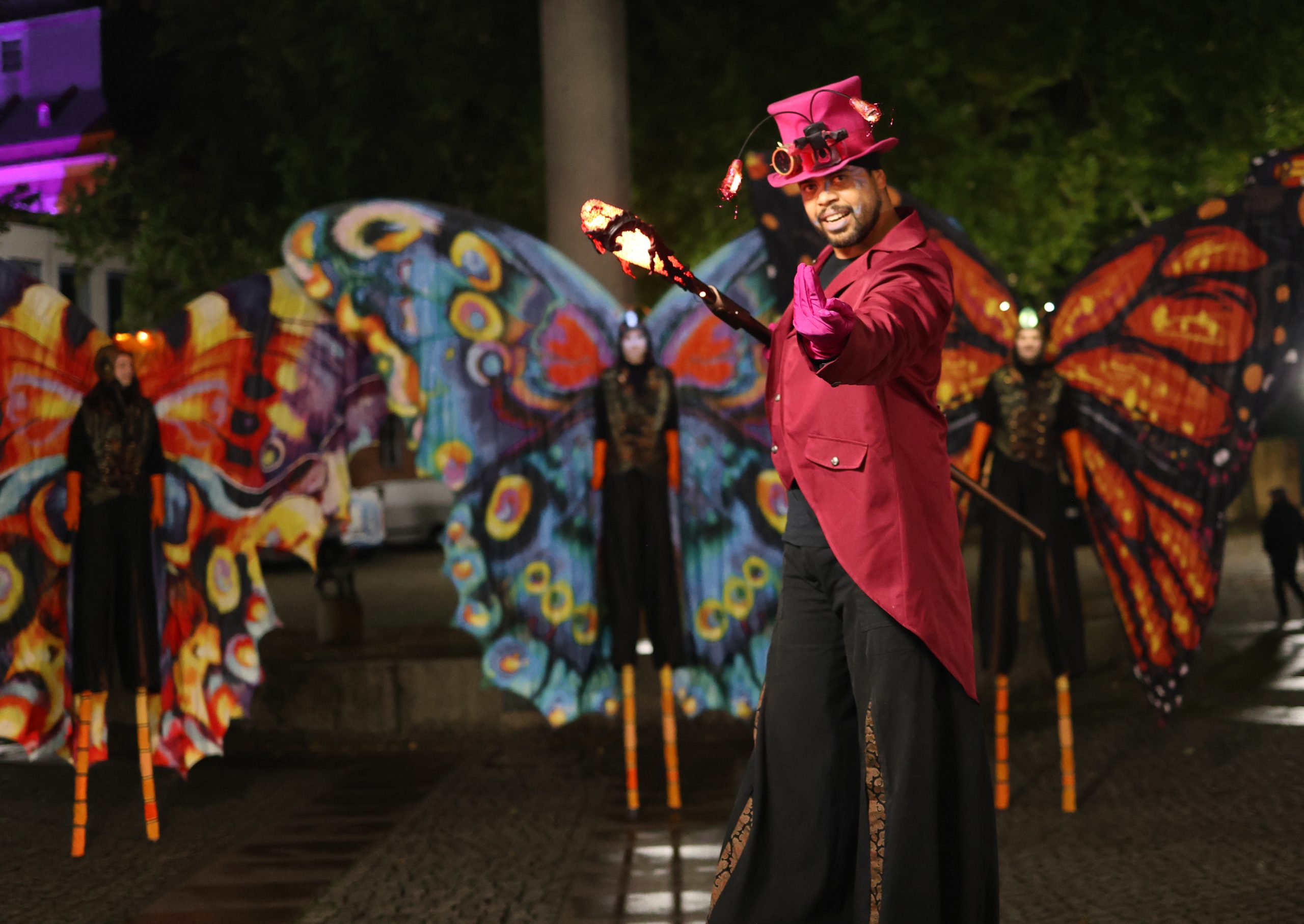 Zauberer Pico präsentiert den stolzen Reigen der magischen Schmetterlinge. Ihrem kraftvollen Spiel voller Leichtigkeit und Eleganz kann sich keiner entziehen. Mit ihren wundervollen, leuchtend bunten und kunstvollen Flügeln überstrahlen die riesigen Figuren eindrucksvoll alle Gäste.