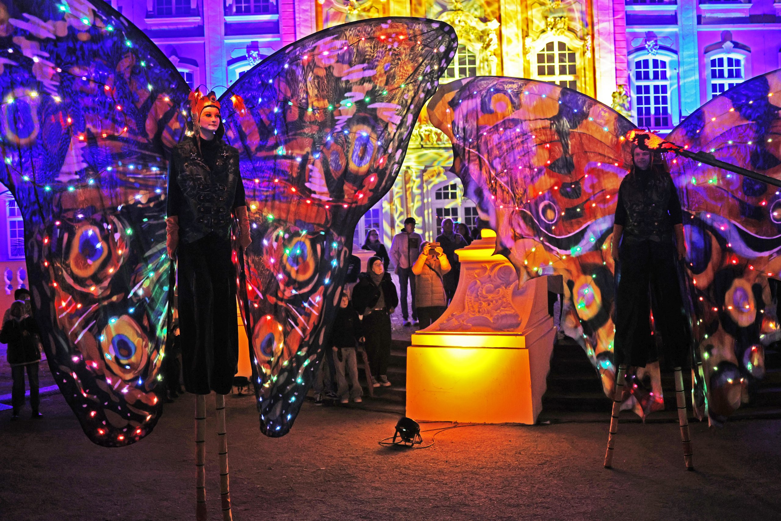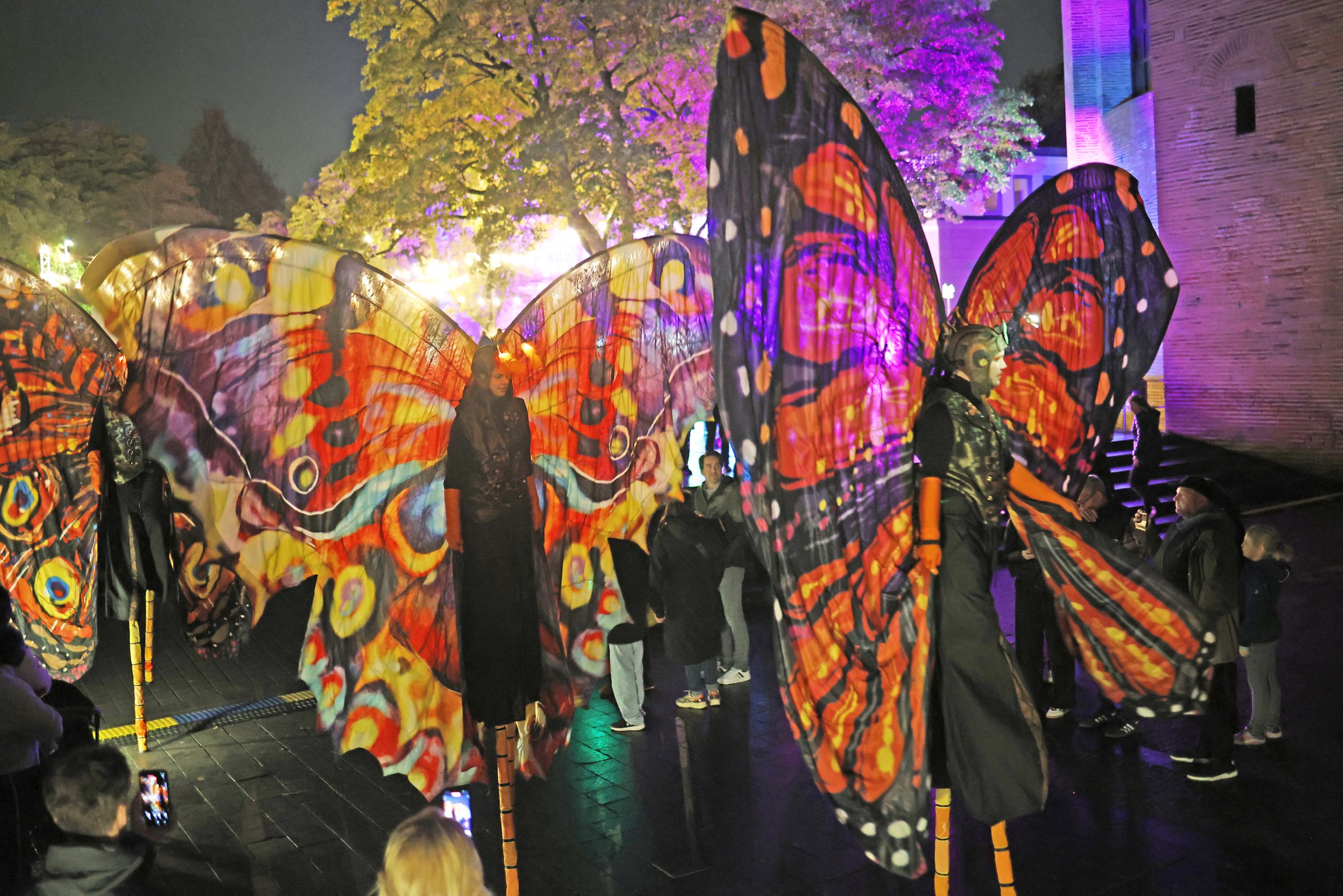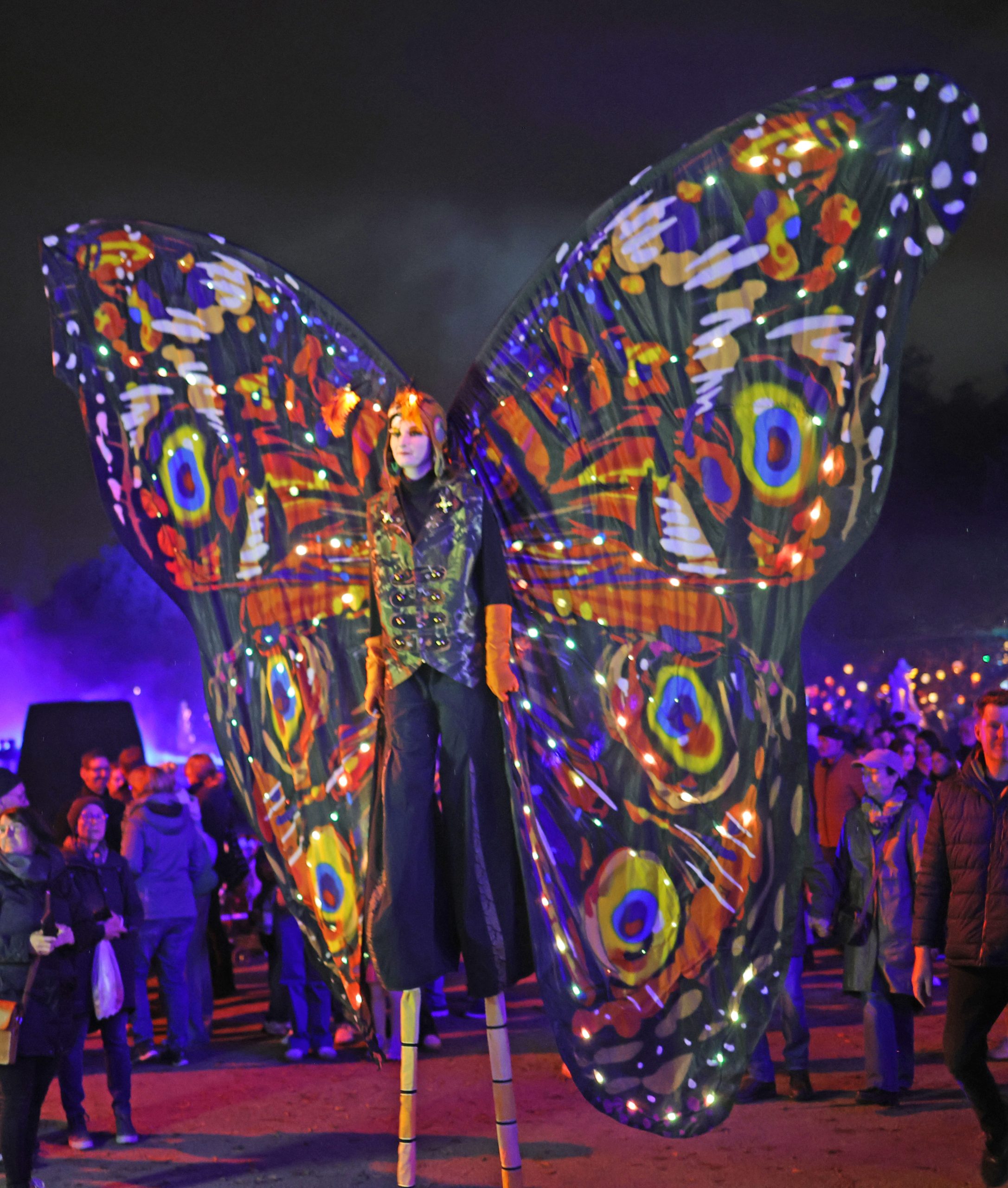 Zauberer Pico präsentiert den stolzen Reigen der magischen Schmetterlinge. Ihrem kraftvollen Spiel voller Leichtigkeit und Eleganz kann sich keiner entziehen. Mit ihren wundervollen, leuchtend bunten und kunstvollen Flügeln überstrahlen die riesigen Figuren eindrucksvoll alle Gäste.
