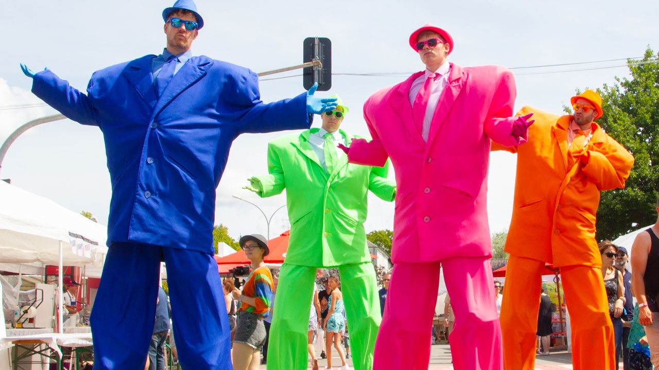 Best spirit with every large step: The colourful stiltwalkers Happy Agents are roaring the streets.